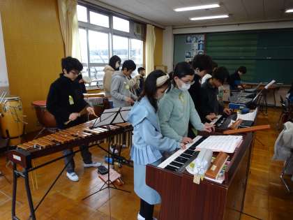 音楽では、合奏の練習をしています。団体演技で使った「怪獣の花唄」の曲を、それぞれパートを決めて合奏しています。テンポの速い曲ですが、一生懸命練習しています。