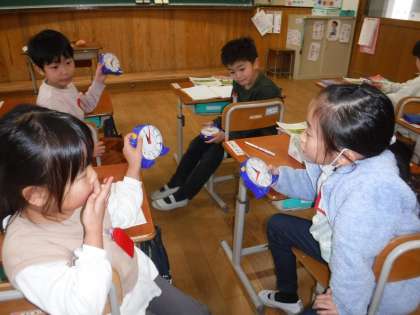算数科「なんじなんぷん」の学習で、時計の短針と長針の位置をもとに、時刻を読む学習をしました。友達と「なんじなんふんゲーム」を繰り返し行うことで、次第に時刻を読むことに慣れてきたようです。今後、普段の生活の中でも、時刻を読む機会を作っていきたいと思っています。