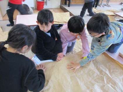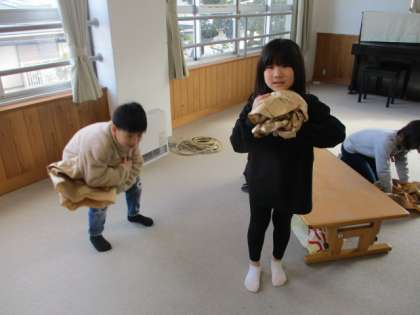 図画工作「くしゃくしゃぎゅ」の学習が始まりました。今日は、クラフト紙をぎゅっと抱きしめて、くしゃくしゃにして楽しみました。