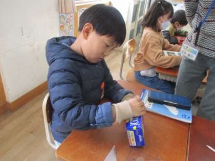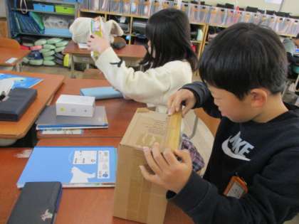 算数科「はこの形」で空き箱を使って、面の数や形を調べました。
