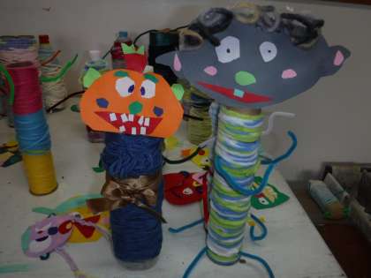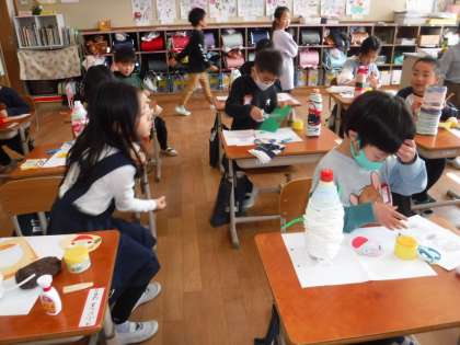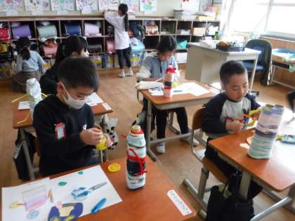図画工作科の学習で、ペットボトルや筒に毛糸を巻き付けて、楽しい「フレンズ」を作っています。この「フレンズ」は、子どもたちが「一緒にいたら楽しいな。」「こんなことが好きな子!」と、想像したものです。どの子も自分の思いを形にしようと、一生懸命そして大興奮の様子で作品づくりを楽しんでいます。楽しい「フレンズ」は、もうすぐ完成です!