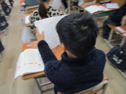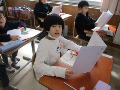 国語科「楽しかったよ、二年生」で、自分たちで書いた作文に表紙をつけて読む練習をしています。