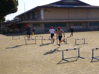 ハードル走に取り組んでいます。自分にあったコースを選び、とびこし方を工夫して練習しています。