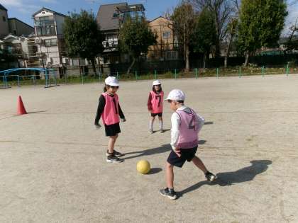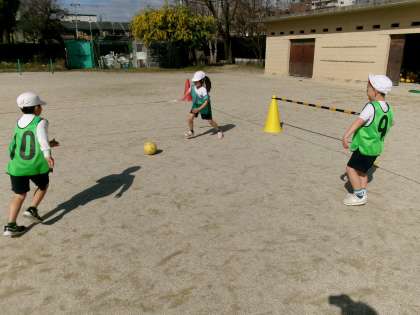サッカーのように、足でボールを蹴って味方にパスをしてゴールを目指します。今日は、準備や片付けのやり方を確かめて、パスやシュートの練習をしました。ボールを止めてから蹴り、味方に一生懸命パスを回していました。