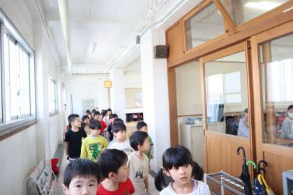 北校舎や南校舎の教室や、運動場を探検しました。さまざまな教室に、みんな驚いていました。