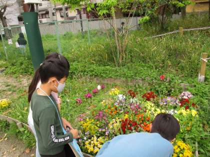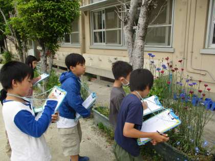 理科の「春の生き物」の学習では、学習園やあかしやの森へ春の生き物探しに行きました。見つけたものを丁寧にカードに描いていました。