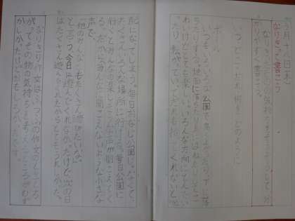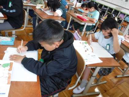 国語科の学習で、自分が好きなものや身近なものになり切って、作文を書きました。「もし○○だったら・・・」と、選んだものがどんなことを考えているのかを想像すると、たくさんアイディアが溢れてきたようです。その後、友達の作文を読み合い、楽しみました。