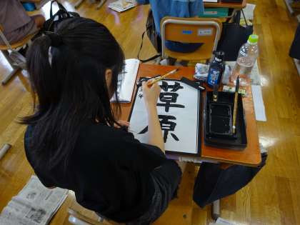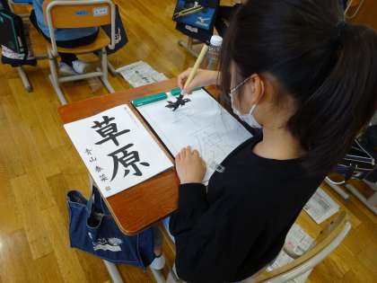 書写の学習では、「草原」を書きました。「原」の中と外の部分の組み立て方に気を付けて書きました。最初はバランスをとるのが難しそうでしたが、練習を重ねていくごとに、少しずつ納得のいく文字が書けたようです。