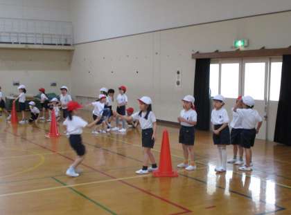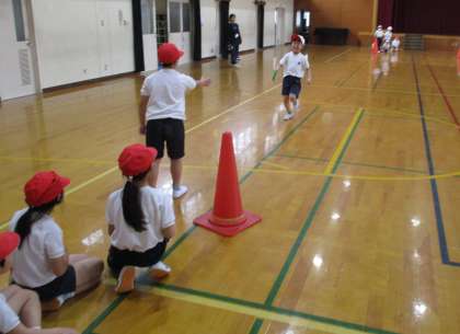 体育科の学習で、体育館でリレーをしました。