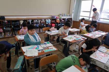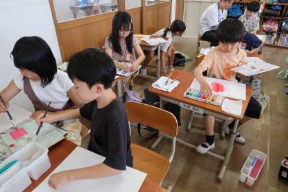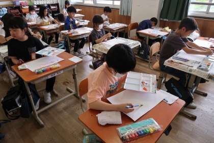 図画工作科「絵の具 筆 水 いい感じ」の学習の様子です。