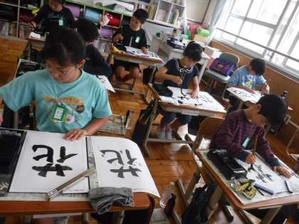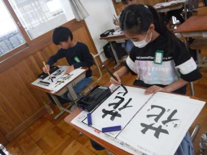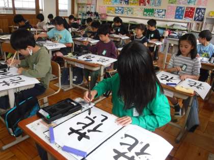 書写の授業で、毛筆で「花」という字を書きました。3年生の時の学習を思い出しながら、とめやはらいに気を付けて書きました。姿勢を正しながら、筆の運びを意識している様子が見られました。