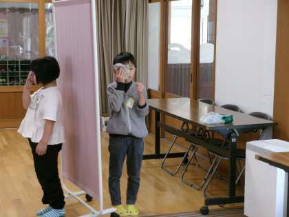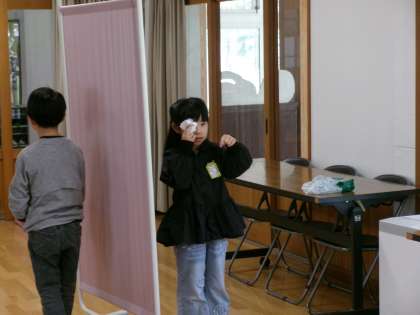 視力検査がありました。上手にハンカチで目を隠しながら、指で空いている方向を答えていました。