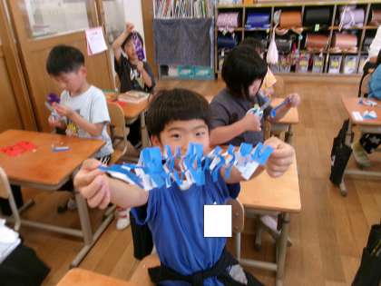 色紙を広げてみるとおもしろい模様のようになっていて、みんな楽しそうにかざりを作っていました。