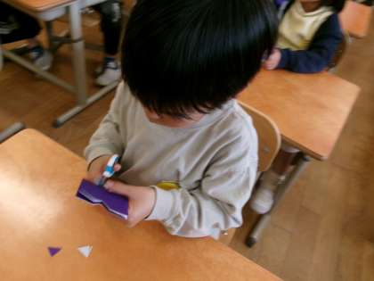 ハサミの使い方を学習した後に色紙を折って切り、かざりをつくりました。