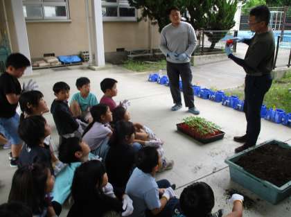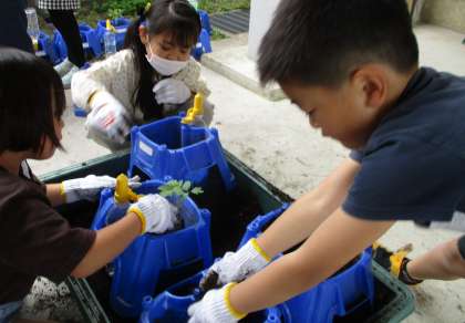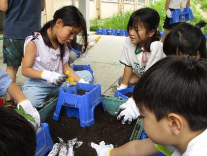 自分たちの鉢に土を入れて、優しくミニトマトの苗を植えました。