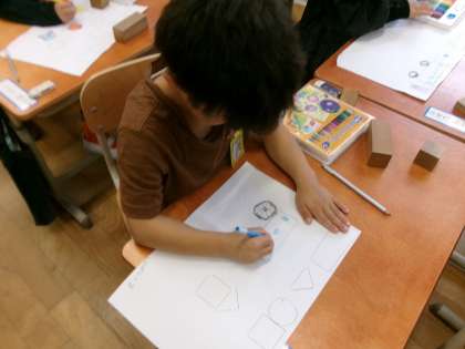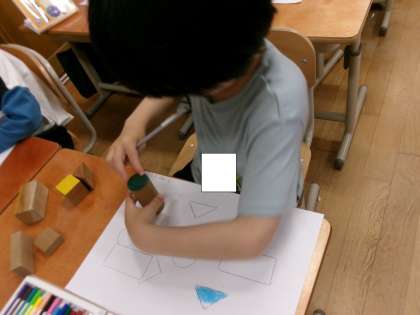 丸や四角の形を使って、家やロケットなどの絵を楽しそうに描いていました。