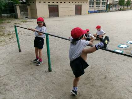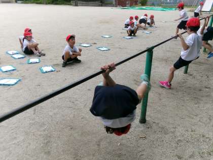 今日は、出来る技を連続何回できるかチャレンジしました。「地球回り」や「こうもりふり」などの技を、お友達同士で数えながら頑張っていました。