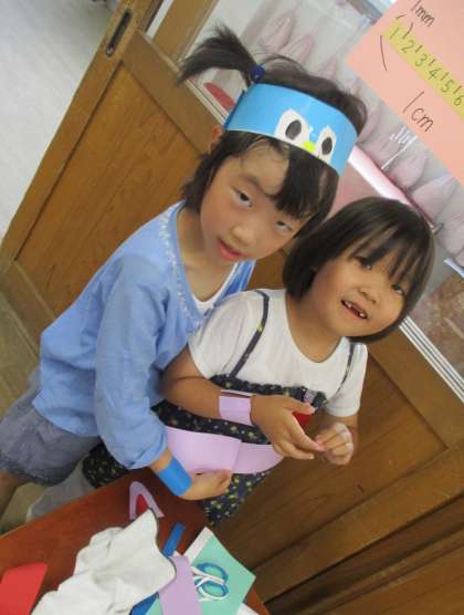 図画工作科の学習で、先週に引き続いて、わっかを作って変身をしました。