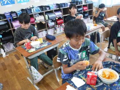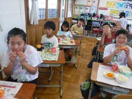 今日の給食のデザートに、冷凍みかんが出ました。今日は、とても暑い日だったので、冷たいみかんに、みんな大喜び!「ひんやり〜!」「10個は食べられるな!」と、嬉しそうに食べていました。