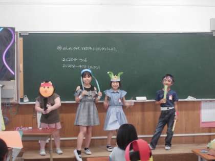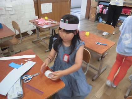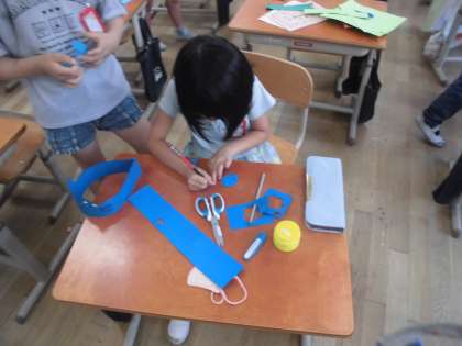 図画工作の学習で、わっかを使って「何に変身しようかな。」と考えながら工夫して作品を作っていました。授業の最後には、何に変身したのかをみんなに紹介しました。