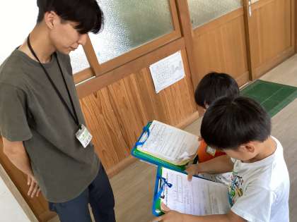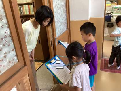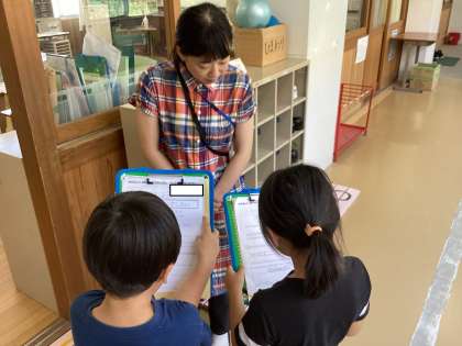 生活科「なかよしいっぱいがっこうたんけん」の学習で、朱雀第四小学校の学校博士になるために、先生にインタビューをしています。