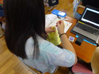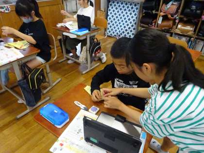 裁縫の学習が始まりました。針と糸を使って、玉結び、玉どめをしました。慣れない中、一生懸命取り組む姿が見られました。