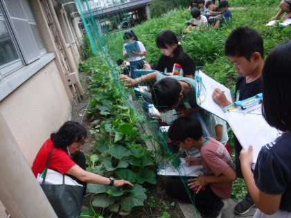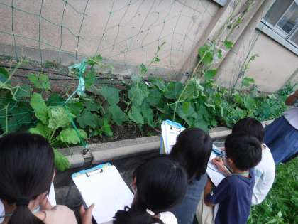 理科で育てているヒョウタンが、大きくなってきました。今日は久々に、どれくらい生長したのかを観察しました。葉がみんなの顔くらい大きくなっていたり、茎にとげがついていたり、新しい発見がありました。