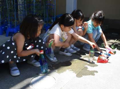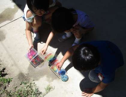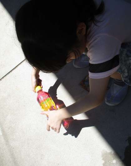 図画工作科の学習で、プラスチック容器やペットボトルに色を塗って、光に当ててみました。水を入れると、光が揺らめいてきれいでした。