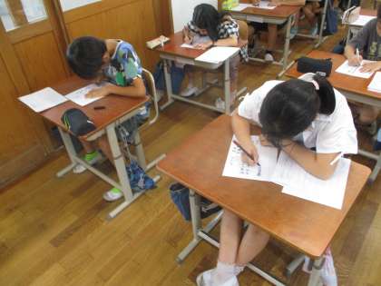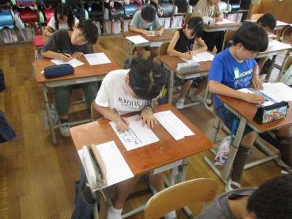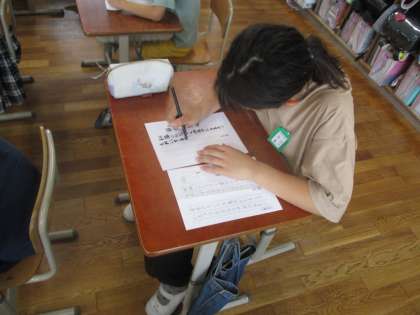 書写の学習で、フェルトペンで短歌を書きました。お手本をよく見て、一字一字丁寧に清書していました。
