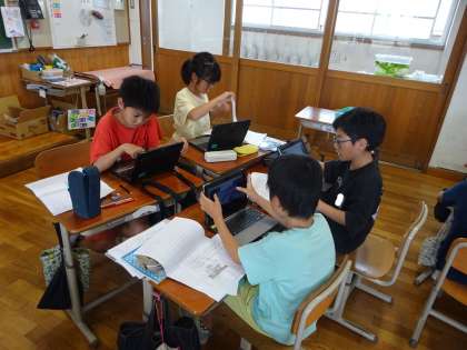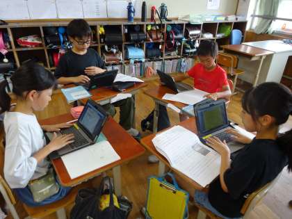 国語科でまとめた報告文を読み合い、グループごとに自然エネルギーについてスライドにまとめていきます。
