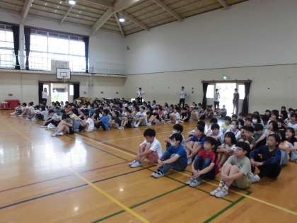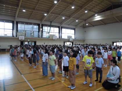 令和6年度の1学期終業式を8時50分から体育館で行いました。短時間ではありましたが大変むし暑い中、子どもたちは校歌を歌ったり静かに先生方のお話を聞いたりしました。