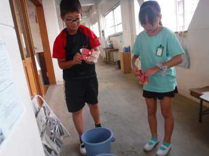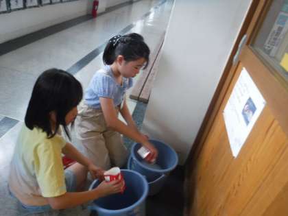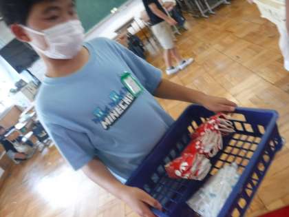 給食委員会の人が、牛乳パックの片付けについて話に来てくれました。おいしくいただいた給食を最後まで気持ちよく片付けができるようにと、給食委員会の人たちが作成したポスターを見ながら、片付けをしていました。