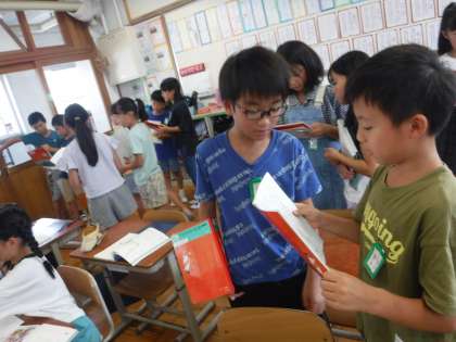 国語科の学習です。挿絵を見ながら、話がつながるようにつなぎ言葉を使って文を書きました。「前の文を否定しているから、『しかし』がぴったりだよ。」と、友達と確認しながら、いくつも文作りにチャレンジしていました。