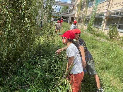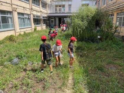 授業では、秋の生き物を見つけに校内の探検に行きました。