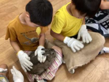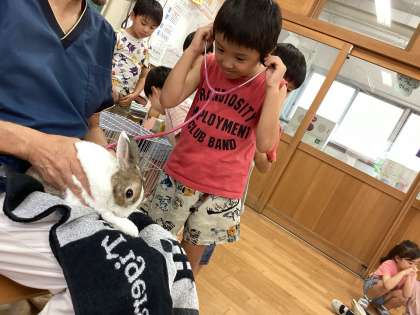 ウサギのだっこの仕方や生態について教えてもらったり、聴診器で心音を聞かせてもらったりしました。