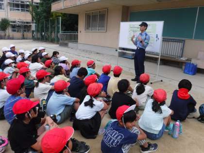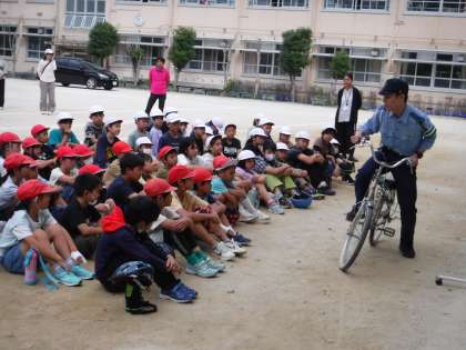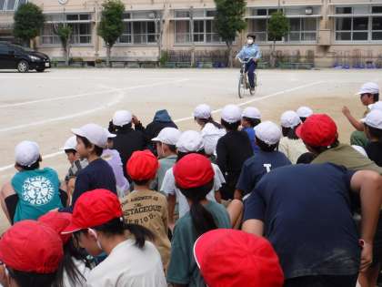 自転車教室が行われました。まずは、中京警察署の方から、正しい自転車の乗り方となぜ、正しい乗り方をしなければならないかを教えていただきました。普段の乗り方を思い出しながら、みんな真剣に話を聞いていました。