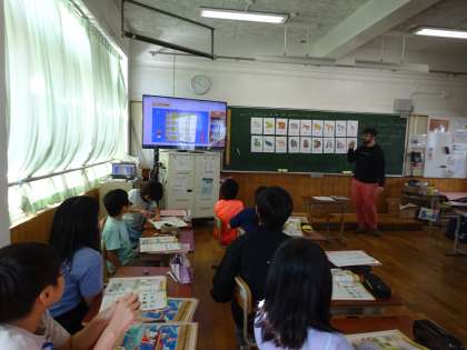 ALTの先生と一緒に、道案内の言い方を練習しました。動物園の地図をもとに、ペアで道案内をしました。