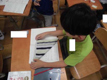 ノートや、ハンカチのたてとよこの長さを比べました。重ねたり、折ったりしてたてとよこを比べることができました。