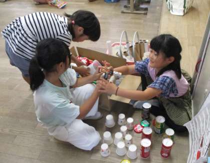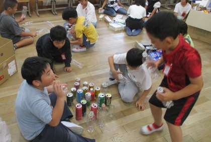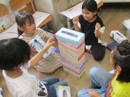 生活科の学習で、ペットボトル、箱やトイレットペーパーの芯を使って、遊びました。
