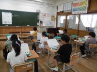 図画工作科の学習で、いろいろな形に切った紙を画用紙に置いていき、何に見えるのか考えながら、作品を作りました。