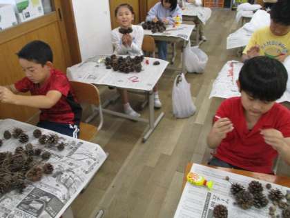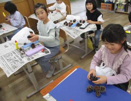 先週の遠足で拾った、どんぐりやまつぼっくりを使って、秋のアート作品を作りました。