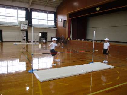 走り高とびの学習が始まりました。4年生で、初めて行う学習でです。高く跳ぶために、踏み切り足を知る必要があるので、自分の利き足を確認したり、バーに向かって、ななめ方向から助走して走ることを意識して練習をしました。