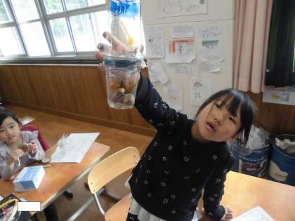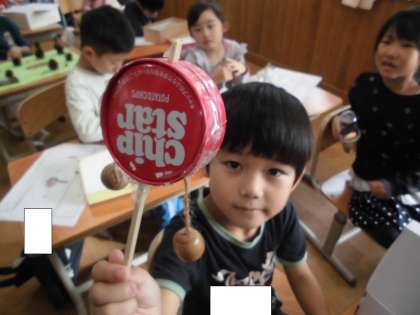 生活科で作っている秋のおもちゃが,完成に近づいています。形が出来上がったら、かざりをつけたり、ペンで模様を書いたりして工夫していました。