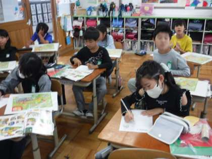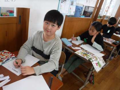 図画工作科で、ビー玉が転がり落ちるおもちゃを作っています。まずは、どんな風にビー玉が転がっていくかを想像しながら、アイディアスケッチを描きました。