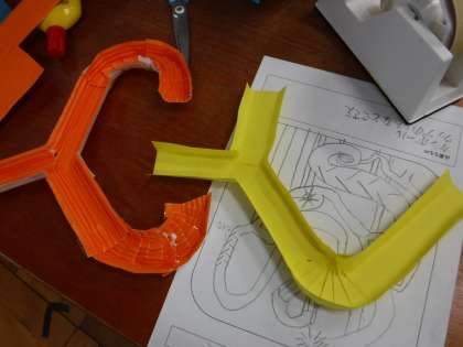 アイディアスケッチを基に、早速コースを作り始めました。まっすぐ転がるコースだけではなく、枝分かれコース、くねくねコースなど色々なコースを作っています。