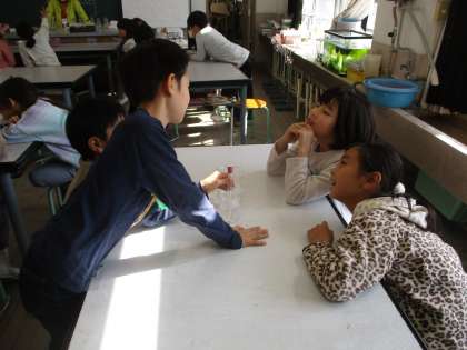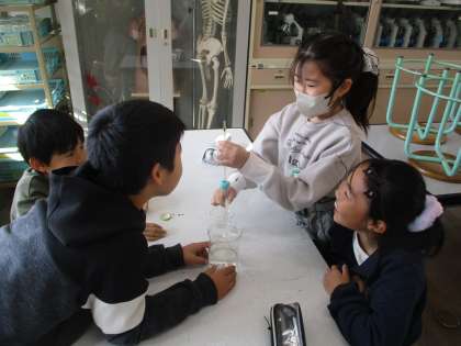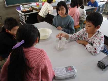 理科の学習では、空気は温度によって体積が変わるのかの実験をしました。ゼリーを入れたガラス管を温めたり、冷やしたりするとどうなるかを調べました。空気は温めると体積が大きくなり、冷やすと小さくなることが分かりました。