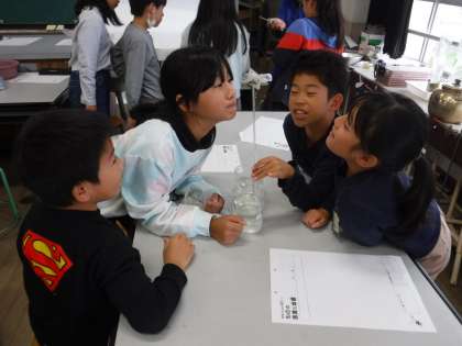 理科の学習で実験を行っています。今日は、水は温めると体積が大きくなるのかをゼリーを使いながら実験を行いました。