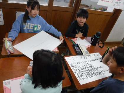 あかしや学習発表会で、「植物パワーで地球を守ろう」で学習してきたことを発表します。そこで、まず、どんなことを伝えるのかをグループで話し合いました。クイズなどを交えて伝えます。どんな発表になるか、楽しみです。