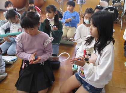 音楽室で、タンブリンやすず、カスタネットなどの楽器のリズムに合わせて、「山のポルカ」の演奏をしました。