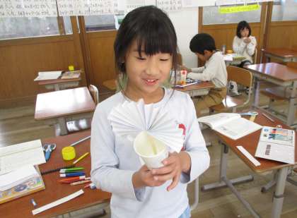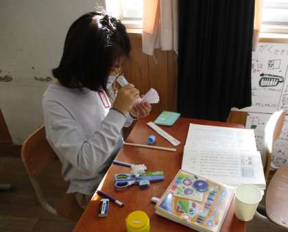説明書を見ながら、「これは、ここに貼り付けるんだね」「この順番で合っているかな」と、友達と相談しながら作っていました。